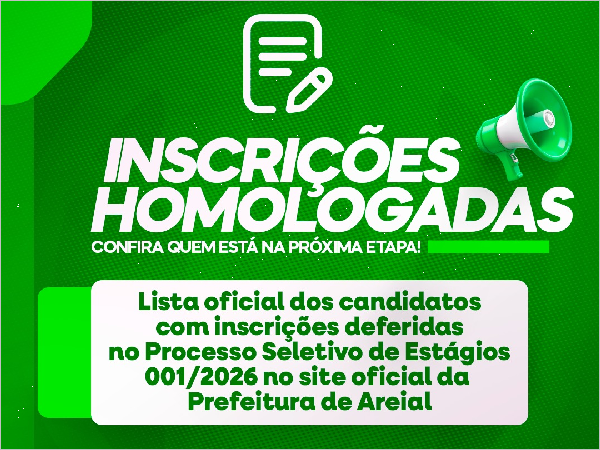 A Prefeitura Municipal de Areial, por meio da Secretaria de Juventude, Esporte e Cultura (SEJEC), torna pública a 4ª lista de convocação dos estagiários selecionados para atuação nas diversas secretarias municipais.